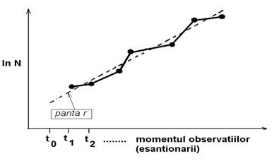 Fig. 5-27. Determinarea directa a ratei de crestere r (panta unei drepte) dupa liniarizarea functiei exponentiale de crestere (dupa Frontier si Pichod-Vial 1998).