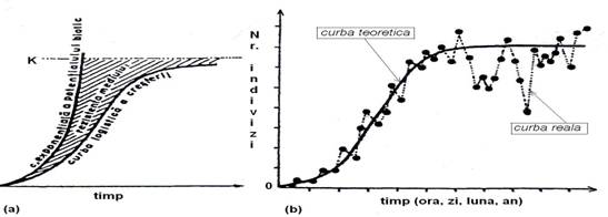 Fig. 5-28. (a). Reprezentarea schematica a modelului curbei logistice de crestere si a curbei exponentiale a potentialului biotic. (b). Curba logistica, teoretica si reala (dupa Stan 1994 (1995).