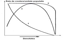 Fig. 5-29. Trei modele ale cresterii populatiei in relatie cu densitatea (curba 1 = tipul de relatie invers dependenta de densitate; curba 2 = tipul independent de densitate; curba 3 - tipul Allee (dupa Odum 1993).