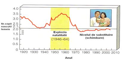 Se observa ca in perioada 1930-1940 a urmat un declin dupa care o explozie demografica pe intervalul 1946-1964, iar aceasta a fost continuata de o stabilizare (nivel de substituire), pe perioada 1975-2005.