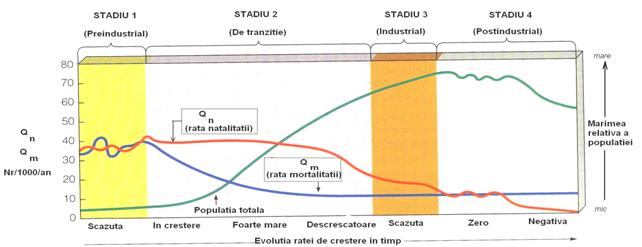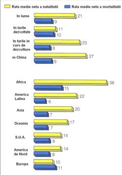 Evolutia ratei natalitatii si mortalitatii pentru populatia umana din diferite tari si zone de pe glob arata ca rata natalitatii este deosebit de mare tocmai in tarile foarte sarace si scade progresiv odata cu crestere nivelului de trai, gradul de civilizatie si puterea economica, industriala (Fig. 5-31; 5-32-B).