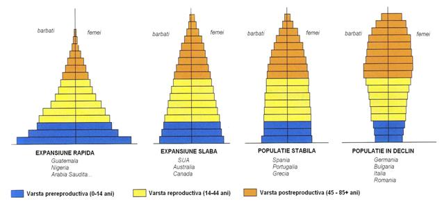 Studiul relatiei dintre varsta sexelor pentru 4 categorii reprezentative de evolutie a nivelului populatiei (Fig. 5-32-A) a evidentiat ca tocmai populatiile care au o larga pondere a varstei prereproductive (0-14 ani) sunt si populatiile cu cresterea cea mai rapida a populatiei. Ori acest lucru este caracteristic din pacate tocmai pentru tarile sarace. In tarile cu nivel de viata crescut cresterea este slaba sau stabila iar aici incepe sa domine varsta reproductiva si postreproductiva. Un caz interesant este cel prezentat de a 4-a diagrama, pentru populatiile in declin. Se observa nivelul scazut pentru populatia de varsta prereproductiva, dar o dominare a varstei postreproductive. Aici sunt tarile care au mai multi batrani decat tineri. Sunt tari in curs de dezvoltare iar aici se pare ca exista mai multi factori de influenta.