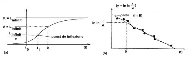 Fig. 5-35. Curba normala de crestere Gompertz (a) si reprezentarea liniarizata a curbei prin logaritmare (dupa Frontier si Pichod-Vial 1998).
