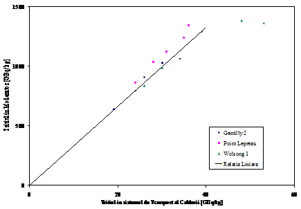 Determinarile concentratiei tritiului din apa grea din moderator si din sistemul primar de transport al caldurii, au dus la concluzia ca, intre cele doua siruri de valori exista o stransa corelatie. In figura 4.5.2 se prezinta corelatia dintre nivele de tritiu masurate in moderator si in sistemul principal de transport al caldurii, stabilita pentru 3 centrale canadiene: Gentilly 2, Point Lepreau si Wolsong 1.