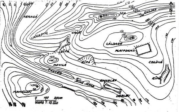 reprezentarea nivelmentului prin curbe de nivel corelate cu scara planului (de ex., echidistanta de 1 metru la scara 1:1000) si prin puncte topografice cu indicarea cotei de inaltime