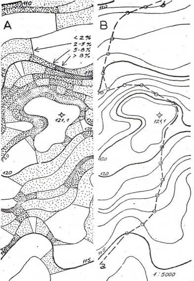 Se parcurge intervalul dintre curbele de nivel marcand coincidenta acestor dimensiuni care marcheaza trecerea de la o categorie de panta la alta, cu distanta dintre curbele de nivel. Portiunile dintre curbele de nivel situate in acelasi interval de panta (sub 2% intre 2-5%, 5-8% si peste 8%) se hasureaza gradat sau se coloreaza de la intensitate inchisa (pantele mari) la intensitate deschisa (pantele mici). Se scot in evidenta prin linii de contur zonele cu conditii similare de dispunere a cladirilor.