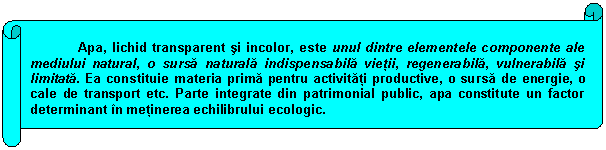 Considerata multa vreme ca o sursa inepuizabila a naturii, apa se dovedeste a nu fi - totusi - disponibila in cantitati suficiente si de o calitate corespunzatoare nevoilor de folosire, in anumite perioade si in anumite regiuni ale Terrei.
