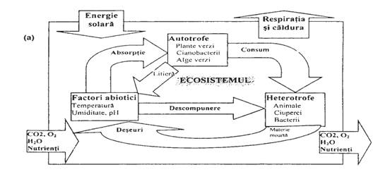 Este esential faptul ca intre biocenoza (subsistem biologic, energetic) si habitatul sau, biotopul (subsistem primar anorganic), furnizor de substante si energie biocenozei, exista o relatie unitara si legica. Impreuna definesc un sistem biotic complex - ecosistemul (Fig. 6-12). Cele doua componente nu sunt entitati morfologice ce se pot localiza ci entitati fiziologice (Stugren 1994).
