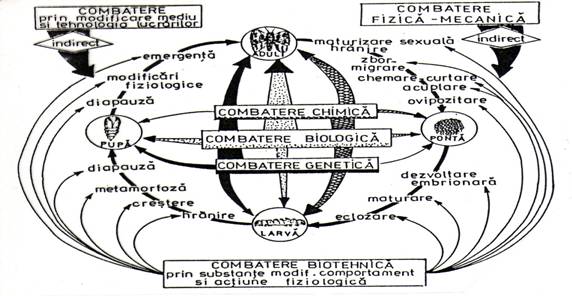 Fig. 6-169. Eficacitatea combaterii biotehnice a insectelor daunatoare din agricultura, comparativ cu celelalte metode. Combaterea biologica, genetica sau chimica actioneaza la nivelul stadiilor, dar si acolo in mod diferit (ilustrat de grosimea sagetilor), in timp ce combaterea biotehnica (prin mediatori chimici) actioneaza la nivelul metabolismului (functiilor) (dupa Stan 1996; schema imaginata pe baza datelor din literatura de specialitate; modif. dupa Charmillot 1983)