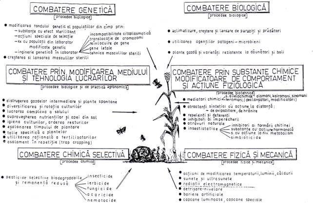 Conceptul de combatere propriu-zisa in cadrul acestui grup, Combaterea Insectelor Daunatoare (Insect Pest Control), este astazi efectiv exclus din vorbirea curenta a specialistilor, deoarece in conceptiile moderne daunatorii constituie si ei verigi importante in lanturile trofice si in retelele trofice, fapt pentru care biologii trebuie sa-i accepte ca si pe speciile folositoare sau indiferente. In momentul in care era insa la moda se vorbea frecvent de cele 6 directii care ar asigura o calitate superioara a mediului, cu posibilitatea de obtinere de produse agro-alimentare ecologice, nepoluate, prin folosirea integrata a cel putin doua din cele 6 directii de combatere a daunatorilor (Fig. 6-170).