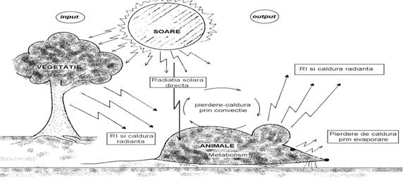 Procesul de adaptare a organismelor la un regim termic implica modificari in echilibrul relatiei: caldura castigata (input) = caldura pierduta (output) (Brewer, 1988). Cele doua parti ale relatiei de mai sus sunt sugestiv ilustrate in Fig. 2-9. Se observa ca exista 3 surse importante de castig de caldura (radiatia solara, radiatia infrarosie si calorica a mediului inconjurator si metabolismul) si tot 3 surse importante de pierdere a caldurii (radiatia infrarosie si calorica a mediului inconjurator, convectia si evaporarea).