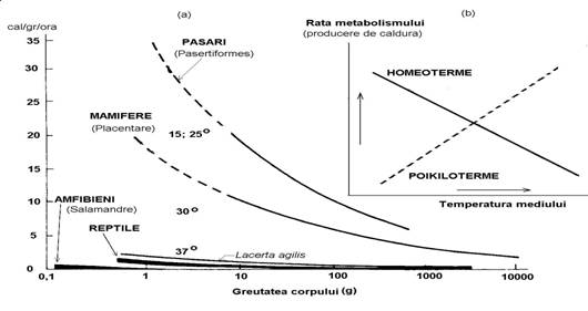 Relatia dintre organisme si mediu este diferita la homeoterme, comparativ cu poikiloterme (Fig. 2-10). Asociat cu cresterea temperaturii mediului crestere rata metabolismului si productia de caldura la poikiloterme, dar scad cele doua procese la homeoterme.