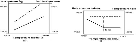 Fig. 2-12. Raspunsul temperaturii corpului (--------) si rata consumului de oxigen ( _______ ) in functie de temperatura mediului ambiant la poikiloterme (a) si homeoterme (b). Reprezentare schematica (dupa Vernberg si Vernberg, 1970; din Collier si colab., 1974).