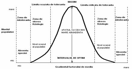 In cadrul intervalului optim se afla o valoare de maxim (Fig. 2-4a). Intre cele doua limite apar variatii de toleranta. Astfel la o aceeasi specie nu toti indivizii prezinta aceeasi amplitudine a tolerantei (de ex. la amfipodul Gammarus lacustris unii indivizi tolereaza variatii de temperatura intre 0 si 30oC; la cea mai mare parte a indivizilor amplitudinea tolerantei este mai restransa, intre 8 si 23oC).