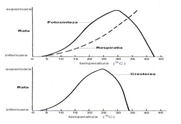 Fig. 2-5. Limita de toleranta. Model ipotetic de evidentiere a influentei temperaturii asupra functiilor unei plante cu evidentierea specificitatii intervalului de toleranta, optimului si maximului (dupa Brewer, 1988).