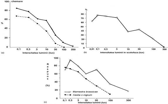 Fig. 2-23. Influenta intensitatii luminii asupra comportamentului de chemare (a), ovipozitarii (b) si de raspuns la feromonul sexual (c), la masculii de Mamestra brassicae si Xestia c-nigrum, in conditii experimentale de laborator (dupa Stan 1991)