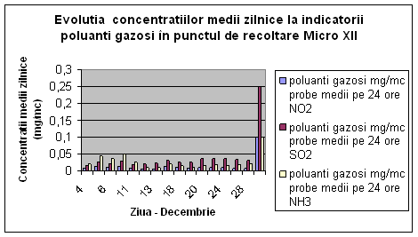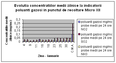 In ce priveste poluantii gazosi ( SO2, NO2, NH3 ) nu s-au realizat depasiri in zona Micro XII Targoviste. S-a luat in consideratie valorile concentratiei maxime admisibile pentru SO2- 0,25 mg/mc, pentru NO2 - 0,1 mg/mc, pentru NH3 - 0,1 mg/mc. ( vezi tabelele )
