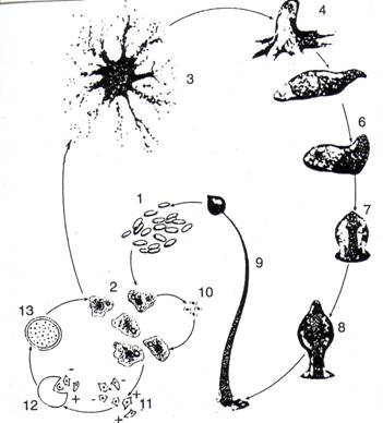 Fig. 32. Ciclul de viata la Dictyostelium discoideum (Protozoa - Rhizopoda). Detalii si semnificatia cifrelor, sunt date in text (dupa Bozzone, 2001).