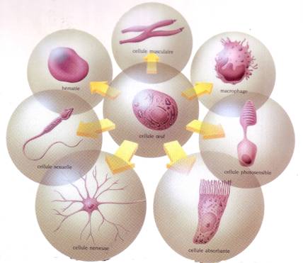 Fig. 33. Cateva tipuri de celule specializate la pluricelulare, datorita totipotentei celulei ou (dupa Encyclop. Larousse, 1993).