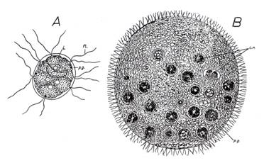 b. Cazul Pandorina morum. La aceasta specie (Flagelate; Phytomastigophora) indivizii care compun colonia sunt de acelasi fel, inglobati intr-o masa gelatinoasa si nediferentiati unii fata de altii (Fig. 34, A). Am vazut ca la Rivularia, desi mult inferioara, specializarea este marcanta