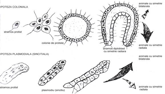 b. Ipoteza sincitiala (plasmodiala (Fig. 35, b). S-a pornit de la un protist sincitial unde nucleul s-a divizat de multe ori dar citoplasma nu l-a partajat. Astfel, in aceeasi citoplasma erau mai multi nuclei. In etapa urmatoare citoplasma inconjoara nucleii si apar membranele care delimiteaza celulele nou formate. Se delimiteaza mai intai celulele de la periferie care delimiteaza ansamblul. Formatiunea evolueaza spre tipul de individ ancestral cu simetrie bilaterala de unde se trag animalele cu simetrie bilaterala.