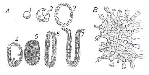 Fig. 36. A. Parenchimula la metazoarele inferioare (model schematic prin ilustrarea ontogenezei hidrei in cadrul inmultirii sexuate); 1 = ou; 2 = morula; 3 = blastula cu blastocel; 4 - imigratia celulelor; 5 = parenchimula; 6 = resorbtie interioara cu aranjarea celulelor interioare pe un singur strat = formarea planulei; 7 = deschiderea cavitatii. B. Proterospongia haeckeli. Am. = individ amiboid; ch. = individ flagelat cu guler (choanocit); ct. = chist; s.g. = substanta gelatinoasa