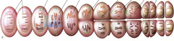 Fig. 37. Mitoza = diviziune celulara asexuata = reproducere clonala (dupa Encyclop. Larousse, 1999).