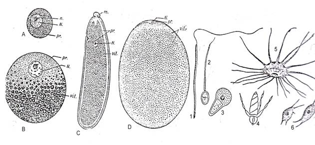 Fig. 40. Diferite feluri de oua (A-D) si diferite tipuri de spermatozoizi (1-6). Oua: A - ou oligolecit (alecit) de stea de mare; B - ou mixolecit de gastropode; C - ou centrolecit de diptere; D - ou telolecit de la cefalopode. m. = micropil; n. = nucleol; N. = nucleu; pr. = protoplasma; vit. = vitelus. Spermatozoizi : 1 - Bithynia sp (Mollusca); 2 - Homo sapiens (Hominidae) ; 3 - Ascaris sp. (Nematoda); 4 - Eupagurus sp. (Crustacea); 5 - Astacus sp. (Crustacea); 6 - Polyphemus pediculus (Crustacea inf.); (dupa Radu si Radu, 1972).