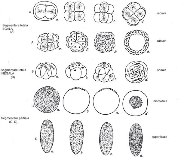 1. Segmentatia. Formarea blastomerelor si constituirea morulei (Fig. 41). Primele stadii ale ontogenezei sunt in general comune tuturor metazoarelor. Oul este supus unor diviziuni succesive care constituie procesul denumit segmentatie si se formeaza grupe de mai multe celule = blastomere (acestea nu se vor separa unele de altele, ca la diviziunea binara a protozoarelor, ci raman intr-o unitate formand un masiv de celule = morula (Fig. 41,A;c-g; B;b-c). Segmentatia prezinta diferite aspecte in functie de grupele de animale, dar pe de alta parte, acestea sunt constante asociat cu cantitatea de vitelus a oului iar pe de alta parte cu caracterele sale ereditare. Exista urmatoarele tipuri de segmentare:
