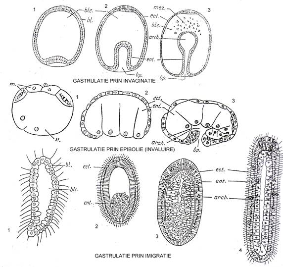 Se cunosc 3 mdalitati de formare a gastrulei: prin invaginare (embolie), prin epibolie (invaluire) si prin imigratie (Fig. 42).