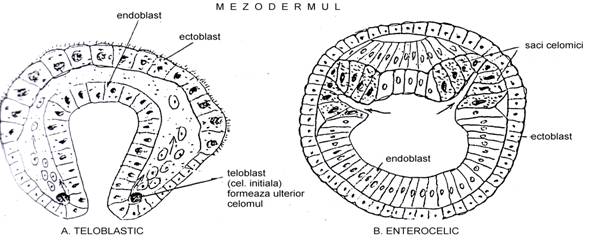 Procesele prin care se formeaza mezodermul sunt variate si complicate. La nevertebrate doua dintre cele mai frecvente sunt: teloblastic si enterocelic. Schema generala a celor doua procedee este ilustrata in Fig. 43.