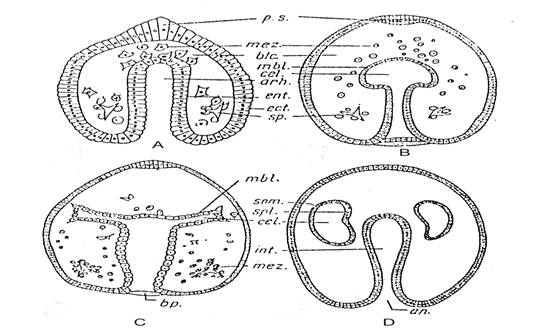 Fig. 44. Formarea mezodermului si mezenchimului la Echinodermata (Asterias sp.). A - gastrula; B - initierea celomului (prin formarea unei dilatatii la extremitatea arhenteronului); C - formarea a doua diverticule simetrice a dilatatiei initiale a arhenteronului; D - formarea a 2 saci celomici din cele doua diverticule. Aici arhenteronul a devenit astfel intestin iar blastoporul - anus; acestea sunt animale deuterostomiene. an. = anus; arh. = arhenteron; blc. = blastocel; bp. = blastopor; cel. = cavitate celomica; ect. = ectoblast; end. = endoderm; ent. = entoblast; int. = intestin; mbl. = mezoblast; mez. = mezenchim; p.s. = placa sincipitala; som. = somatopleura; sp. = spicul; spl. = splanchnopleura (dupa Radu si Radu, 1972).