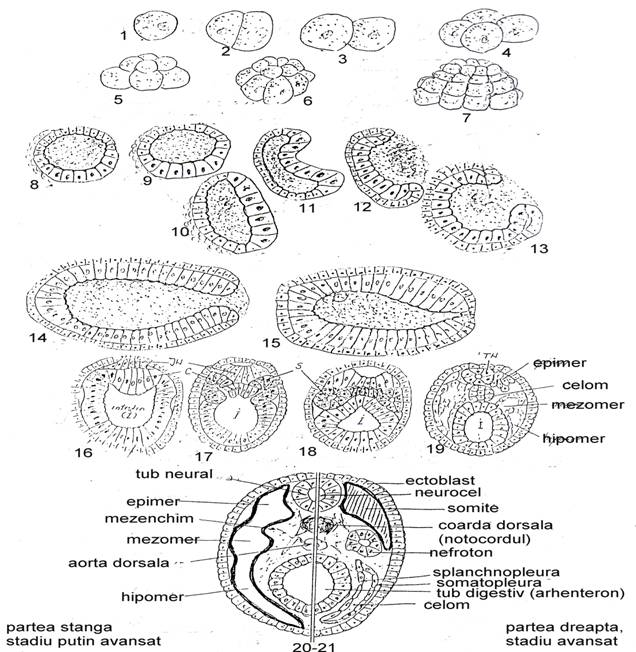 Fig. 4 Segmentatia, gastrulatia, formarea si evolutia mezodermului la protocordatele acraniate (Amphyoxus sp.) (detalii in text) (original).