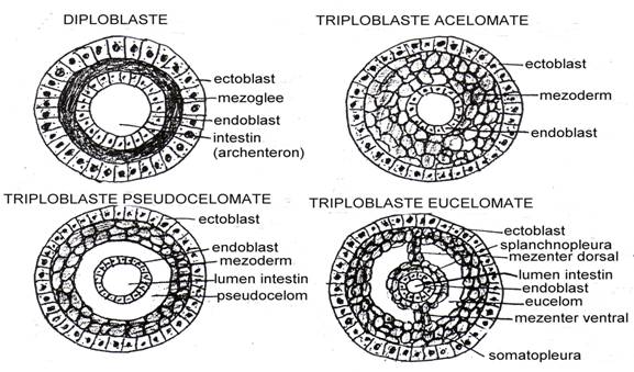Am aratat ca existenta celor doua foite embrionare (ectoblast si endoblast) definesc grupul animalelor diploblastice, iar aparitia si celei de a 3-a foite (mezoblastul), pe cel al triploblastelor. Pentru evolutia in continuare au fost sugerate doua scenarii (Fig. 46):