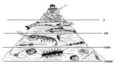 Fig. 6-26. Pozitia de varf a omului an cadrul unei piramide teoretice a structurii unui ecosistem marin (dupa Pequegnat 1961; din Odum 1993). Grupele ecologice, de la baza spre varf sunt: producatori (fitoplancton), consumatori 1 (zooplancton); consumatori 2 (necton); consumator 3 (4) (omul).