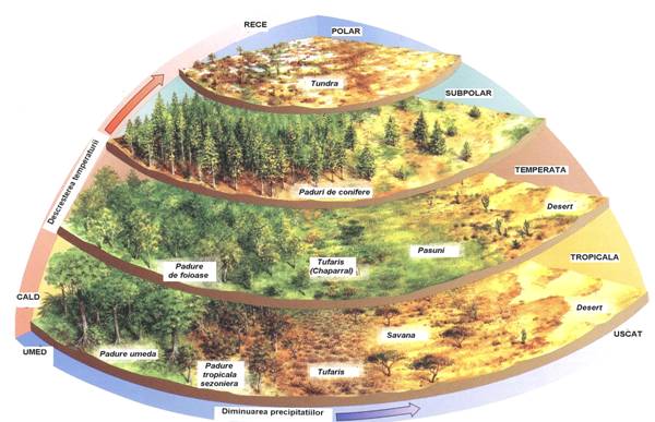 Tipologia si dispunerea vegetatiei pe verticala si orizontala (altitudinal si latitudinal), in biomuri si ecosisteme, in functie de climat (in special temperatura si umiditatea).