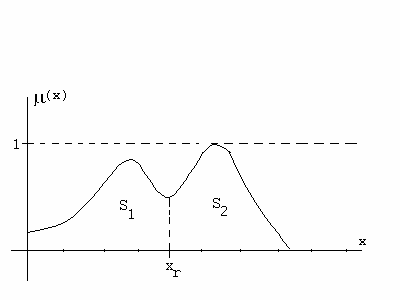 b) Metodele pentru defuzificare servesc pentru determinarea unei valori reale (crisp) atunci cand se da functia sa de apartenenta. Cea mai utilizata metoda pentru defuzificare este metoda centrului de arie, care are ca sens fizic, fig. 1.2, determinarea acelei valori a argumentului care imparte suprafata S in doua arii ponderate S1 si S2, adica