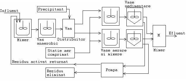 Statia de epurare consta dintr-un reactor anaerobic pentru inlaturarea fosforului biologic, o aerare bio pentru nitrificare si denitrificare si un vas de sedimentare, fig. 1.3. Aceasta statie are o incarcatura organica echivalenta unui oras cu 18.000 de locuitori. Pentru ca efluentul sa aiba o anumita calitate sunt necesare masurile (1) aprovizionarea cu oxigenul necesar pentru nitrificare si denitrificare (2) dozajul de precipitat pentru inlaturarea fosforului aditional (3) coeficientul de raport la ape returnate (4) eliminarea surplusului de rezidiu activat.