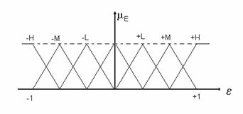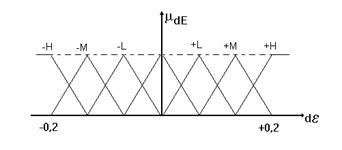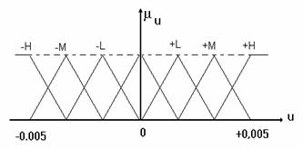 - fuzificarea variabilelor E, dE si dU conform domeniilor de definitie, folosind in aceasta aplicatie 7 variabile lingvistice: -H; -M; -L; 0; +L; +M; +H