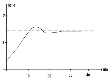 Prin aplicarea metodei pentru defuzificare CoA se calculeaza valoarea reala a comenzii la momentul respectiv de esantionare pentru care s-au calculat valorile erorii de reglare si a derivatei acesteia. in fig. 1.8 se prezinta curba de variatie a productiei reactorului de fermentatie anaeroba a apelor uzate.