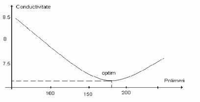 Punctul optim este unde este minimul conductivitatii, dar acest optim se deplaseaza din cauze exogene. Dar, deoarece nu se pot obtine modele matematice ale procesului, pozitia optimului poate fi dedusa din evaluarea reactiilor sistemului la modificarea dozarii cu polimer (deci un regulator extremal). Daca drenarea devine mai buna, atunci modificarea dozarii este in directia buna si se repeta. In apropierea optimului variatiile conductivitatii sunt mai mici la modificarea dozarii polimerului.