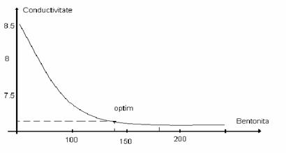 Adaugarea bentonitei pana la o valoare optimala imbunatateste procesul de drenare dupa care nu mai influenteaza, dar nici nu aduce daune. Deci este o dependenta de forma din fig. 1.11, de unde rezulta ca dozarea de bentonita trebuie mentinuta la o valoare cat mai mica, pentru economie de materiale.