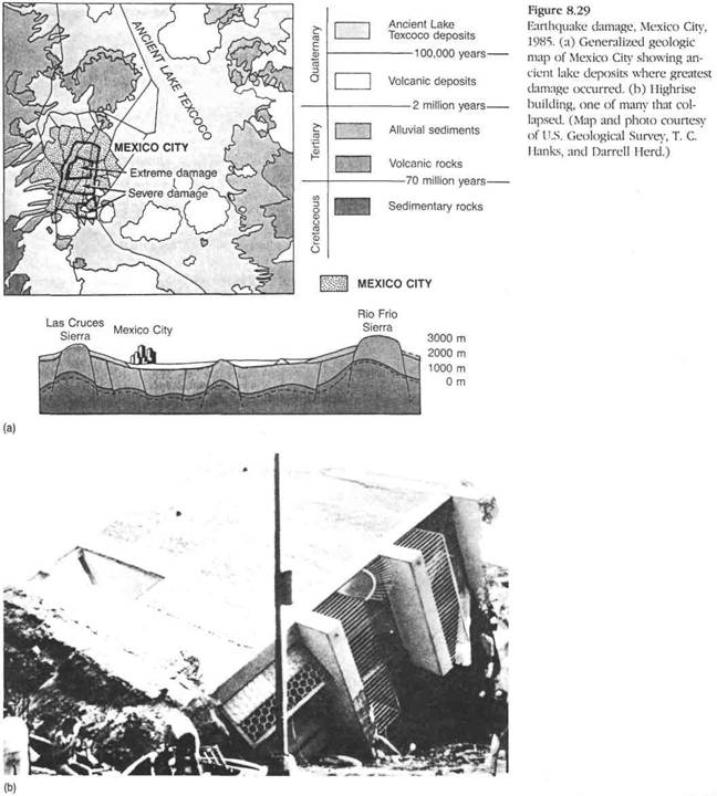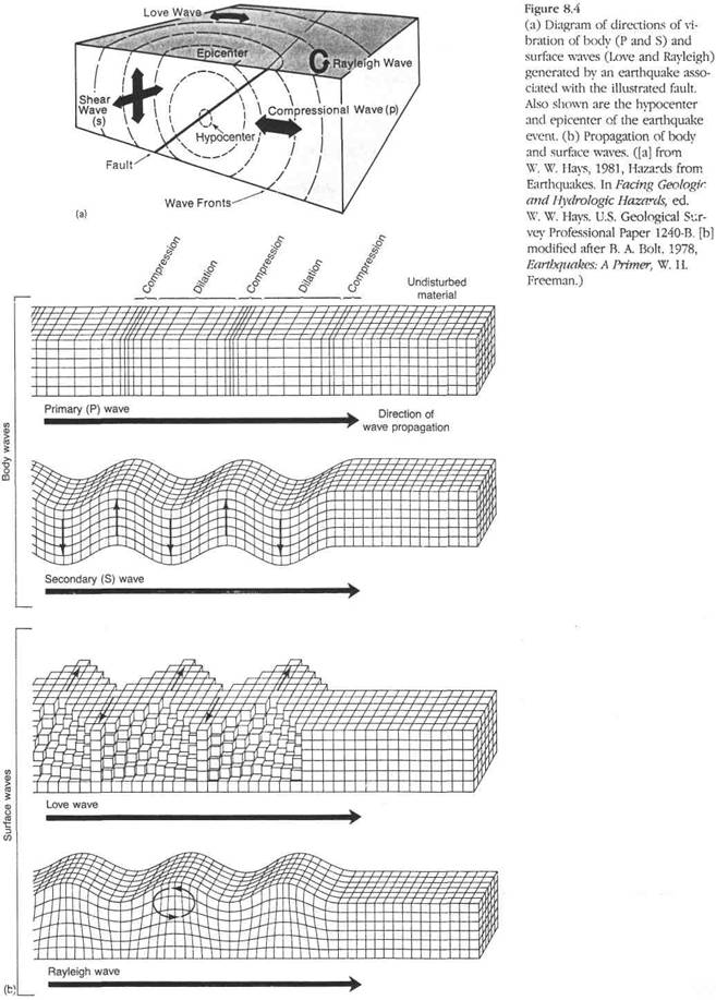 Rupturile din roca si miscarile in lungul faliilor produc unde seismice ce determina vibratiile solului si subsolului. Undele seismice sunt interne si superficiale (fig. 8.4), ambele cu elemente primare (P) si secundare (S). Undele interne primare sunt rapide si migreaza prin mediu solid (5,5 km/secunda in granite) si lichid (1,5 km/secunda in apa). Undele interne secundare migreaza numai prin medii solide si sunt mai lente (3 km/secunda in granite). Undele de suprafata sunt de doua tipuri, Love si Rayleigh, avand viteze mai reduse in raport cu cele interne. Undele care strabat rocile sunt reflectate si refractate la contactul dintre diferite formatiuni sau cand ating suprafata terestra, cauzand amplificari care favorizeaza zguduirea si chiar distrugerea imobilelor. De asemenea faliile si topografia locala influenteaza anizotrop modul de propagare a undelor. Cladirile si alte structuri au adesea frecvente naturale de vibratie asemanatoare cu cele ale undelor primare P, de tip compresional, si S, de tip forfecare (frecvente inalte) sau cu cele superficiale (frecventa joasa). Ca atare pericolul ce planeaza asupra constructiilor este si mai mare; cele joase sunt influentate mai mult de undele interne intrand in vibratie preferential, iar cele inalte sunt mai curand afectate de undele superficiale.