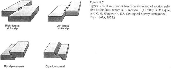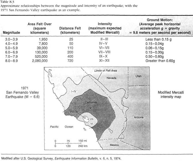 Intensitatea unui cutremur este determinata prin observatii personale referitoare la marimea zguduiturilor si variaza in functie de apropierea de epicentru sau de conditiile locale geologice si ingineresti. Caracteristicile acesteia sunt prezentate in tabelul 8.2, iar relatia magnitudine - intensitate in tabelul 8.3. Tipurile de falii din figura 8.7, atunci cand sunt active (de ex. falia San Andreas), pot determina cutremure. Faliile respective pot fi superficiale sau profunde, primele generand cutremure ca cel de la Skopje din 1961, celelalte, asociate de obicei planelor Benioff. caracterizand de ex. cutremurele din Chile.