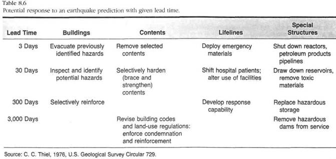 Sistemele de avertizare si prezicerile anti-cutremur nu reprezinta inca o alternativa trainica. Dar tot mai multe comunitati dezvolta planuri de operatiuni de urgenta in cazul unor cutremure catastrofale ( de ex. fig. 8.45 si tabel 8.6). Zonarea seismica si alte metode de reducere a riscului se practica de asemenea in diferite situatii.