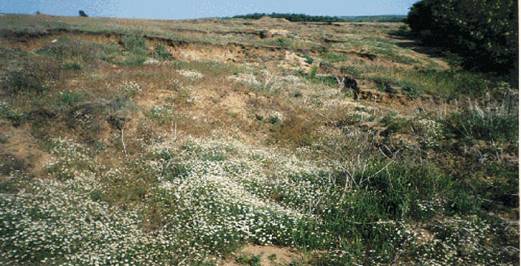 5. Dauna din cauza eroziunii se extinde si asupra altor domenii: innamolirea iazurilor si altor bazine acvatice; poluarea solurilor din depresiuni si a apelor subterane cu produse de uz fitosanitar si fertilizanti spalate de pe versanti, distrugerea cailor de comunicare, a constructiilor hidrotehnice, etc. In ansamblu pierderile anuale directe si indirecte cauzate de eroziune constituie 2432 mln. lei.