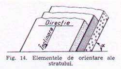 Orientarea unui strat este data de doua elemente : directia si inclinarea (fig.13). Directia stratului reprezinta unghiul diedru facut de o linie orizontala trasata pe suprafata stratului, cu meridianul locului, iar inclinarea este data de unghiul alfa pe care il face linia de cea mai mare panta cu un plan orizontal. Inclinarea stratului este perpendiculara pe directia sa.
