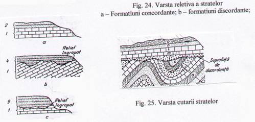 Cand doua formatiuni geologice de varsta diferita se gasesc in raporturi de pralelism, indiferent daca sunt sau nu cutate, formatiunea superioara sta concordant peste cea inferioara (fig.24 a).