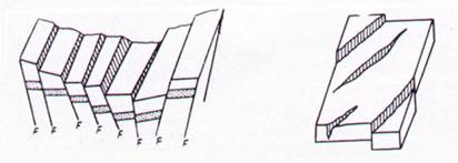 - falii in releu - planele de falii se dispun succesiv pe aceiasi directie (fig. 33) ;