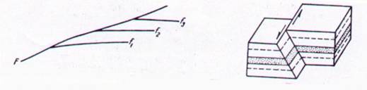 - falii in virgatie sau in ramificatie - asociatii de falii la care planele unor falii secundare se desprind treptat dintr-una principala (fig. 34) ;